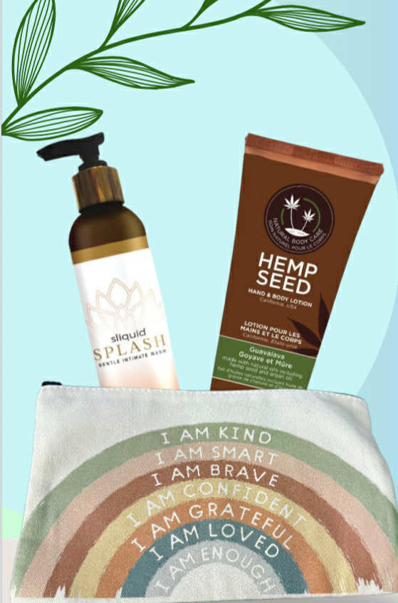Inspirational bag with ph balanced shower wash and h@mp body/ hand lotion.